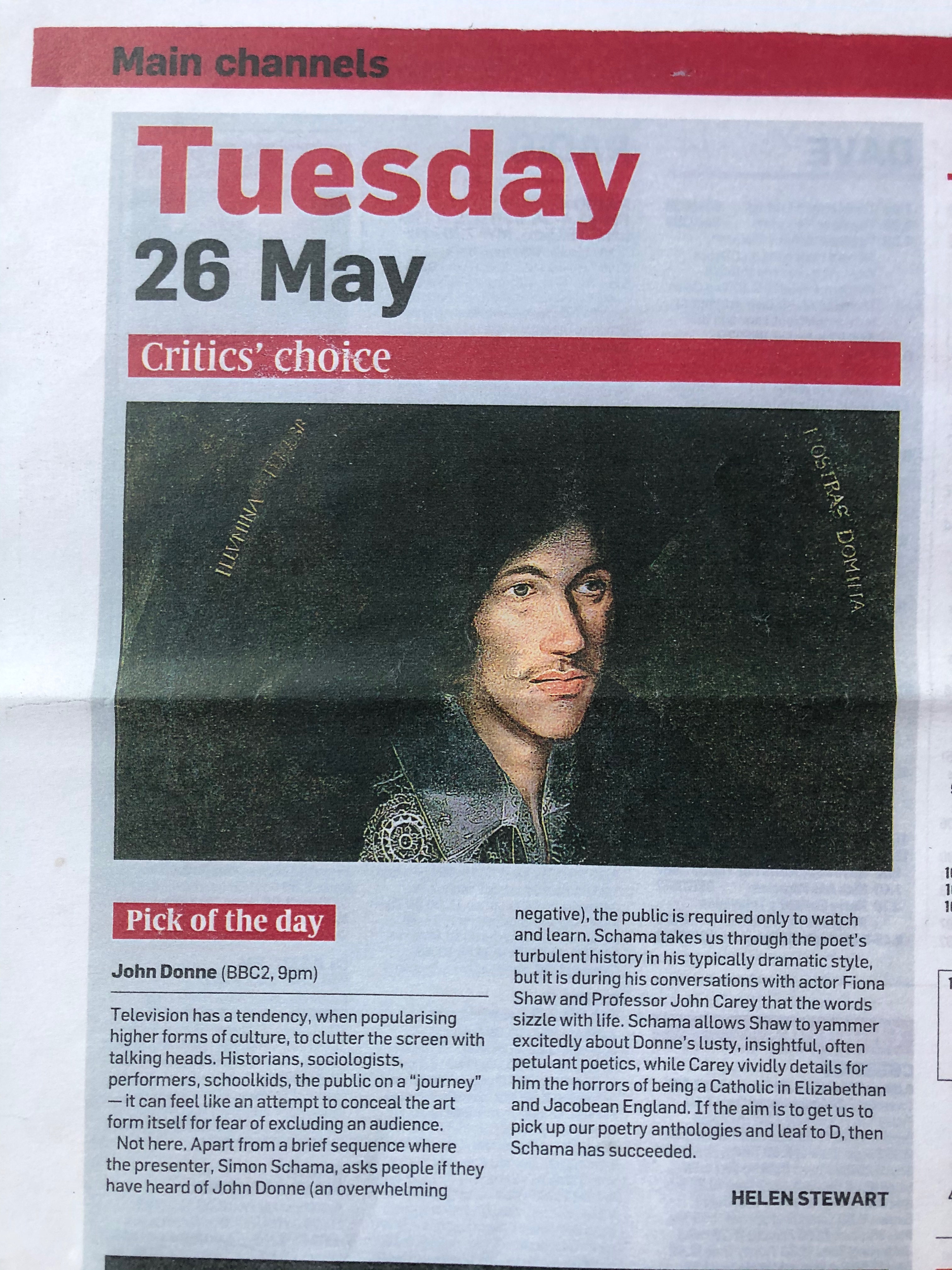 “I urge you to see the Poetry Seasons’ programme on John Donne, with Simon Schama as our guide and Fiona Shaw stunningly reading some poems“ Sunday Times